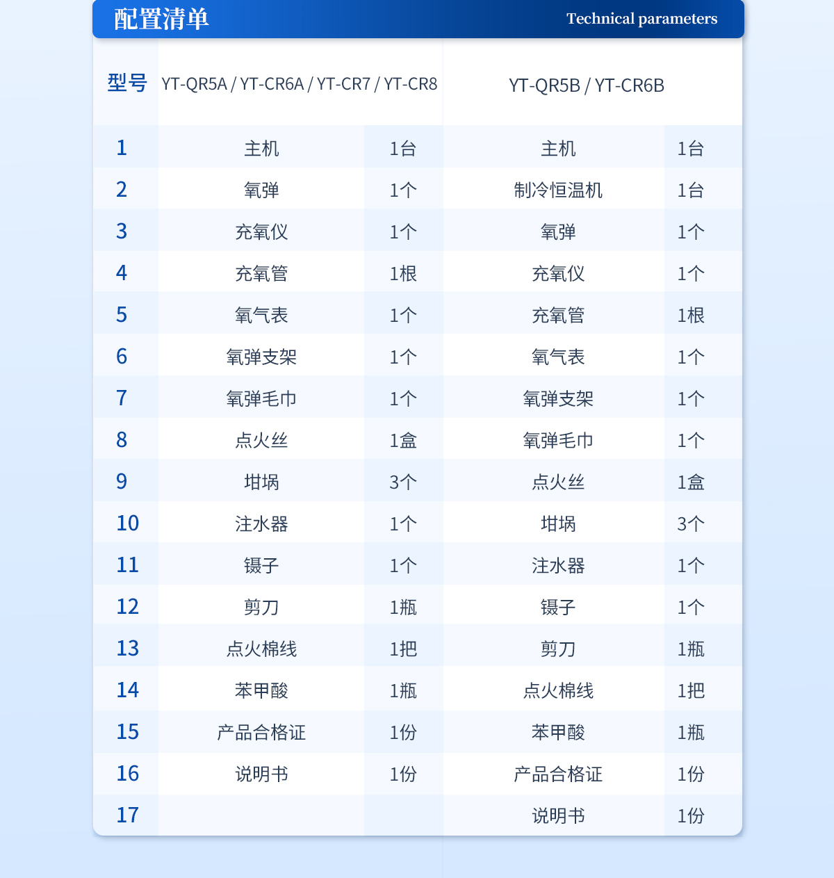 | 主机 1台 | 氧弹 1个 | 充氧仪 1个 | 充氧管 1根 | 氧气表 1个 | 氧弹支架 1个 | 氧弹毛巾 1个 | 点火丝 1盒 | 坩埚 3个 | 注水器 1个 | 镊子 1个 | 剪刀 1瓶 | 点火棉线 1把 | 苯甲酸 1瓶 | 产品合格证 1份 | 说明书 1份 |