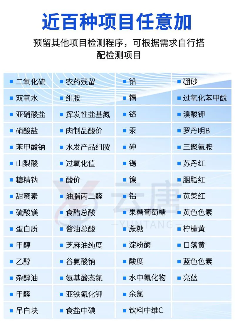 可快速检测各类食品中的甲醛、二氧化硫、亚硝酸盐的含量,仪器预留其他项目检测程序和端口,根据日后需求可方便的自主增加检测项目。