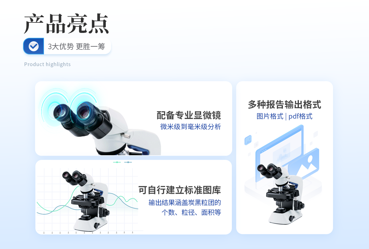 | 1. 采用专业图像分析法由计算机完成炭黑分散度等级的判定,检测精度高; | 2. 对目标炭黑粒径可从微米级到毫米级进行分析; | 3. 配备专业显微镜,配以500万CMOS图像传输器; | 4. 可单张保存图像,图像大小由640*480,1024*768,1280*1024,2592*1944四种大小可供选择; | 5. 丰富的图像处理功能,满足多种图像处理需要; | 6. 软件具有自动和手动两种方式进行炭黑图像分割; | 7. 软件可满足对局部分析的要求; | 8. 配备测微标尺,可进行像素点尺寸校准,并且软件具有移动标尺功能,可进行任意两点距离测量; | 9. 根据橡胶中炭黑种类,建立了由ISO提供的标准图库,以满足客户的目测对比需求; | 10. 客户可以自行建立标准图库; | 11. 输出结果涵盖炭黑粒团的个数、粒径、面积等,并可以数据报表和excel的形式进行输出; | 12. 提供图像灰阶分布图、粒子径分布图、粒度分布图; | 13. 报告结果包括:样品名、标准名、原始图像、灰阶图等。报告输出格式多样,可以选择图片格式或pdf格式进行保存; | 14. 软件试用各种主流操作系统,与win7/win10/winXP等有很好兼容性; | 15. 采用usb2.0数据接口,可适配多种采集设备(如:摄像头或数码相机)。 |