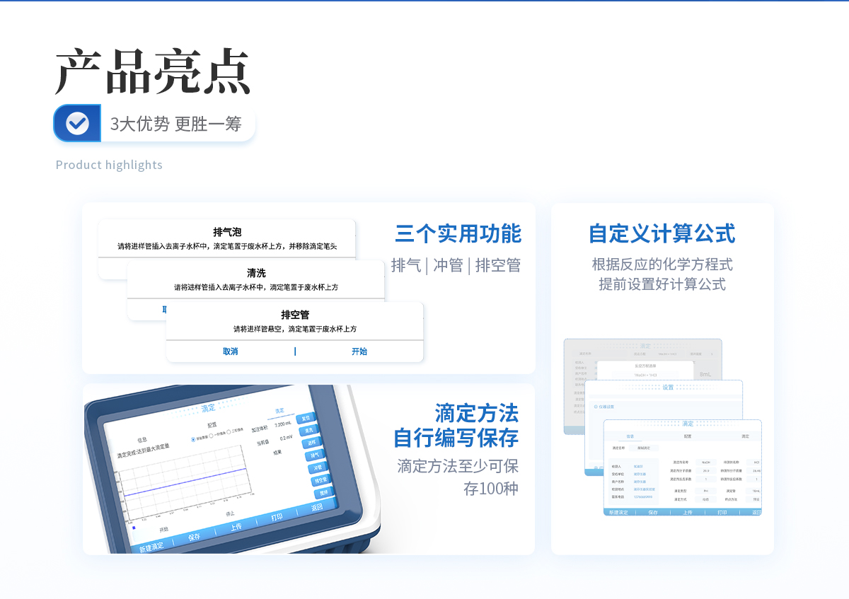 | 1、设备支持电位滴定和pH值测量;用户选择不同电极可进行酸碱滴定、氧化还原滴定、沉淀滴定、络合滴定等多种滴定和pH测量; | 2、用户可选配电导滴定、永停滴定等扩展???,满足用户多功能需求; | 3、设备对国家标准中采用的电位滴定法均满足,用户可根据检测需求选择适配的电极即可; | 4、支持动态滴定、等量滴定、手动滴定的滴定方式,可预设滴定终点或自动识别终点滴定,方便用户根据样品特性选择**滴定工作流程; | 5、可自定义计算公式,根据反应的化学方程式提前设置好计算公式,滴定完成后将自动获得待测物含量; | 6、滴定方法可自行编写并保存,形成滴定方法快捷模式,在使用时可直接选择运行,滴定方法至少可保存100种; | 7、设备可作为实验室常规手动滴定的滴定装置使用;计量泵替代滴定管,磁力搅拌功能替代手动摇晃锥形瓶的工作; | 8、仪器实用的三个功能: (1)排气,可将滴定管或管路内的气泡排出,避免气泡带来的滴定误差; (2)冲管,可以*少的试剂消耗量使管路内充满试剂,实现节省试剂的同时减少试剂混合引入的滴定误差; (3)排空管,可在实验完成后将管路中的液体收集到滴定管内,避免在拆卸管路时产生药液溅洒问题。 |