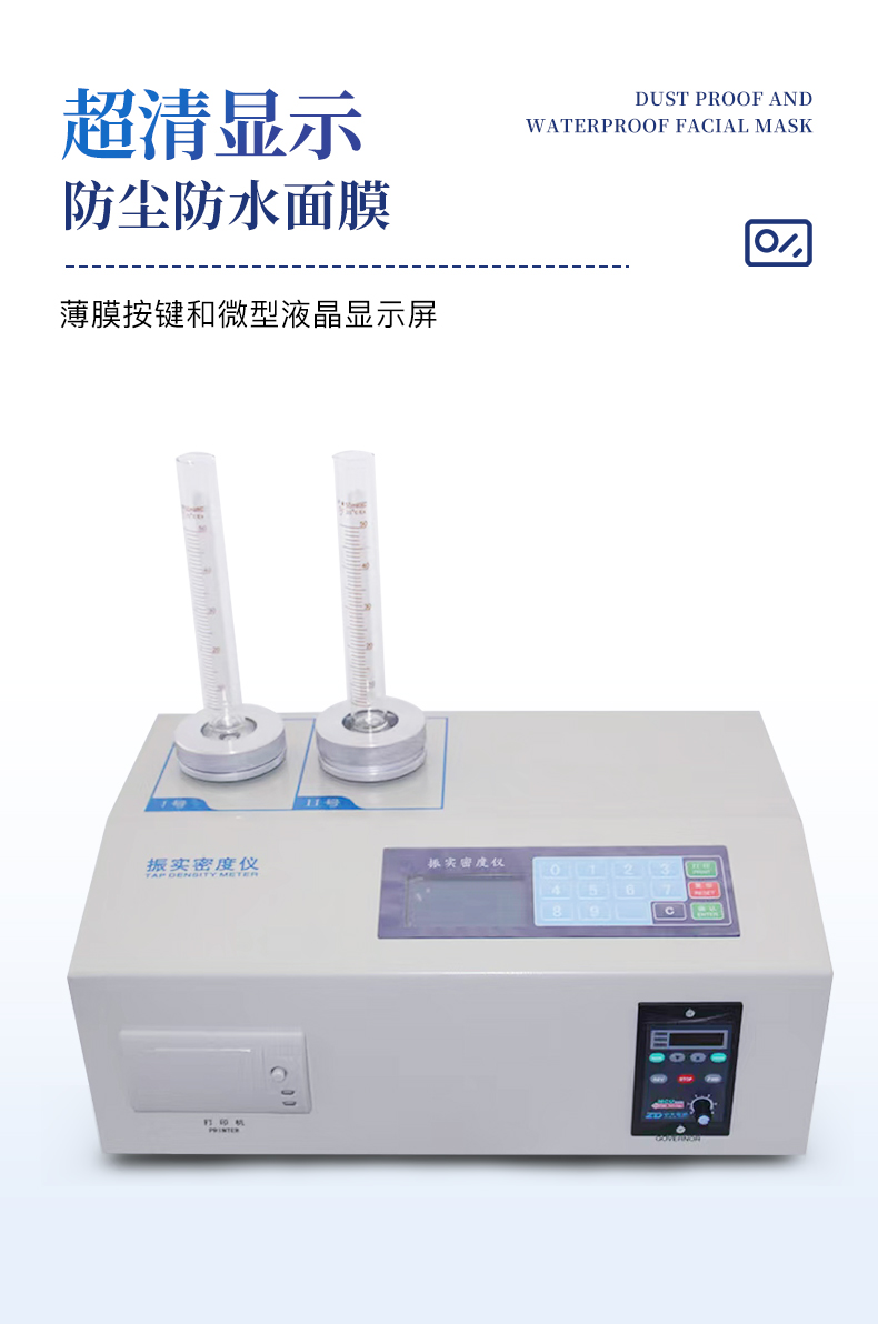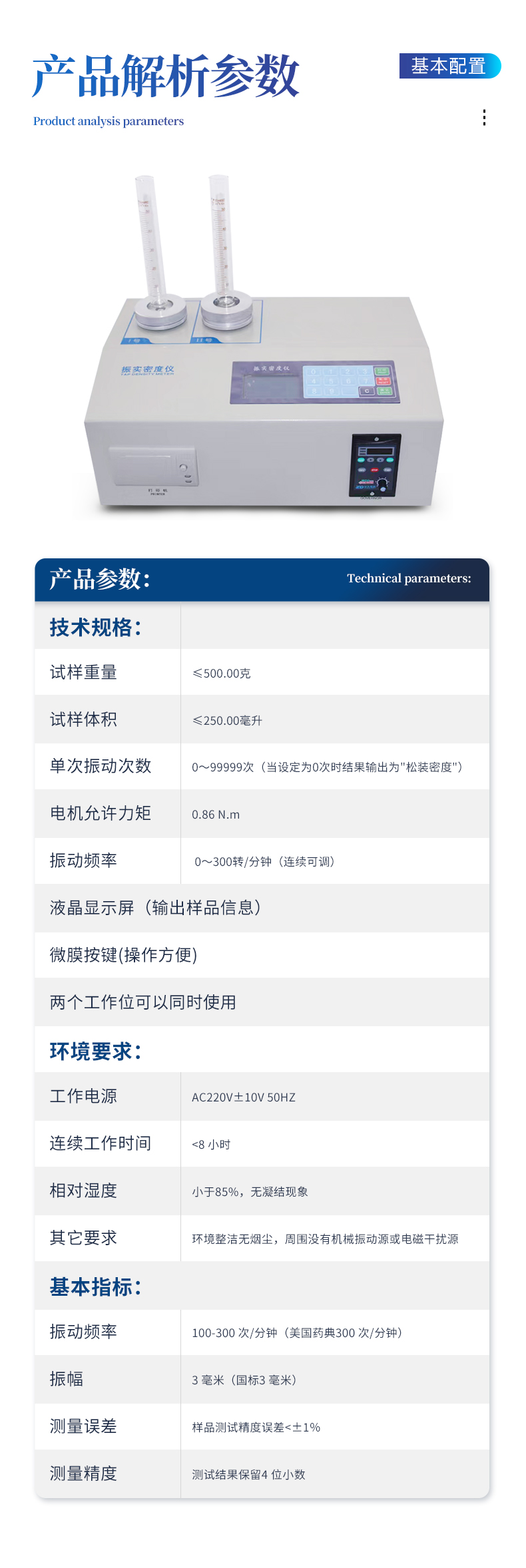| 试样重量:≤500.00克; | 试样体积:≤250.00毫升; | 单次振动次数:0~99999次(当设定为0次时结果输出为"松装密度"); | 电机允许力矩:0.86 N.m; | 振动频率: 0~300转/分钟(连续可调); | 液晶显示屏(输出样品信息); | 微膜按键(操作方便) | 两个工作位可以同时使用 | 振动幅度:3mm,(可调) | ZS2高精度振实密度仪是专门针对固体粉体密度的测量仪器,按照国家标准GB/T 5162-2006/ISO3953:1993,参照美国药典标准研发制造。广泛应用于工业、电池材料、药品材料、奶制品、磨料、造纸、水泥、涂料、科研机构、大中专院校以及各种金属和非金属行业。 |